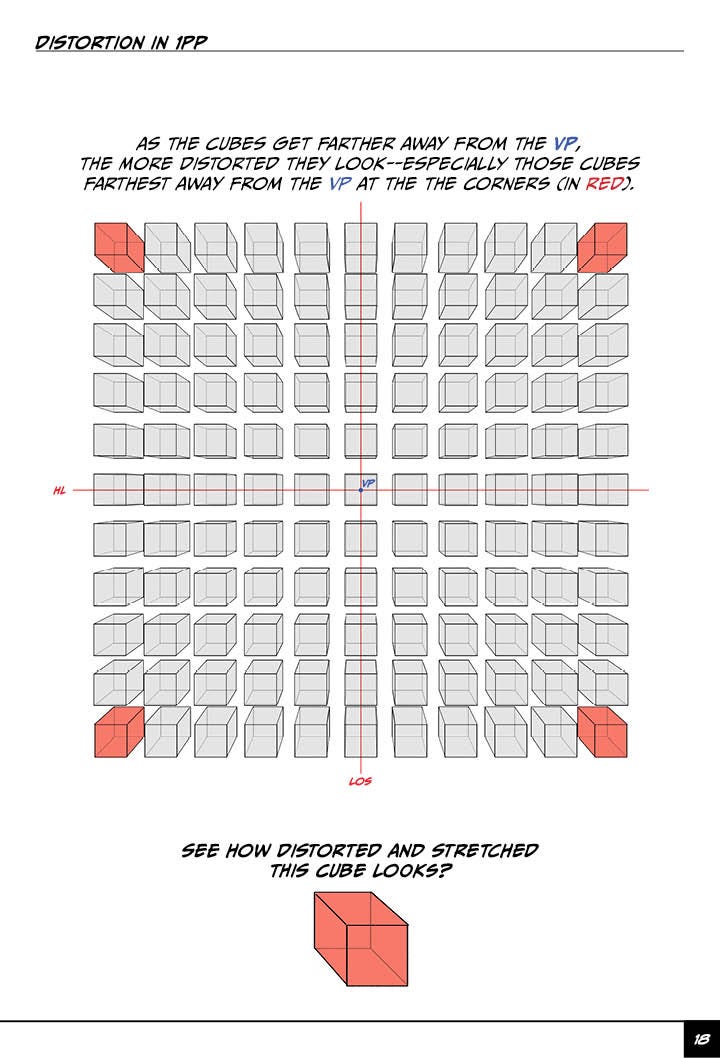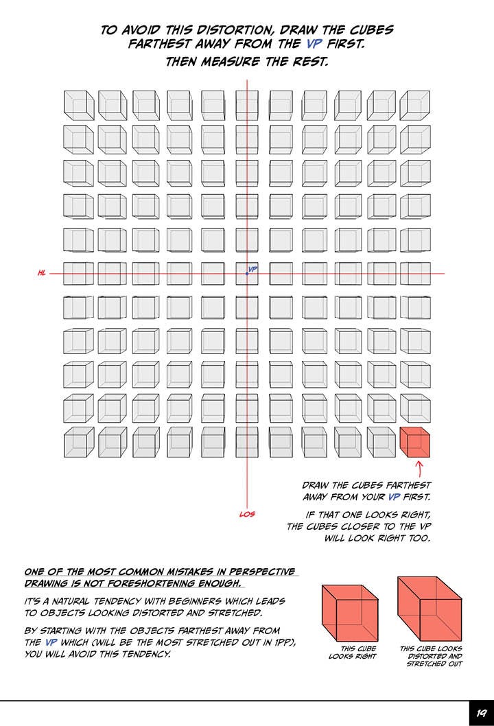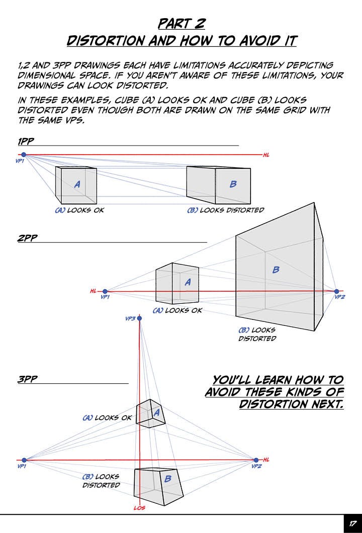The second chapter talks about how perspective drawings are prone to distortion. Many of you probably learned the basics of 1, 2 and 3 point perspective, but even when you follow the procedures, you end up with drawings that look weirdly distorted. This chapter talks about why this happens and some things you can do to overcome it.